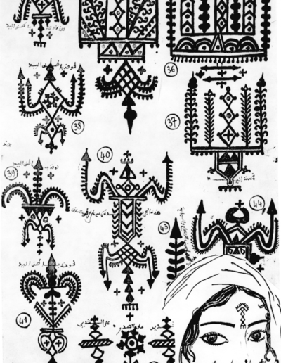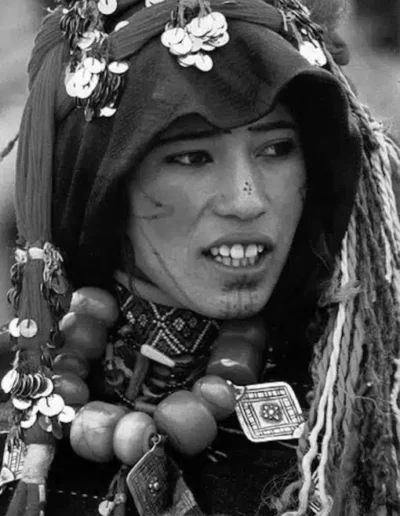 Amazigh tattooing was overwhelmingly a woman’s practice. Women received the tattoos; women applied them; women held the knowledge of which symbols meant what and which designs belonged to which occasions. This makes Amazigh tattooing one of the few major tattoo traditions in the world that was created, transmitted, and controlled entirely by women. Men were occasionally tattooed — small marks for therapeutic purposes (tattooing over the site of a headache or a joint pain, a practice with parallels to Ötzi’s therapeutic tattoos five thousand years earlier), or small identity marks — but the elaborate facial and body tattoos that define the tradition are women’s work, worn by women. The tattooing began early. A girl received her first tattoo, the siyala, on the chin when she reached puberty — typically a vertical line from the lower lip to the bottom of the chin, sometimes flanked by dots or small secondary motifs. The siyala marked the transition from childhood to womanhood: the girl was now a full participant in the community’s life, ready for marriage and capable of bearing children. The tattoo announced this publicly and permanently. As a woman aged, additional tattoos marked further transitions. Marriage brought new marks. Childbirth brought others. The loss of a family member, a significant illness, a change in status within the community — each could be recorded on the skin. The forehead received a tattoo called ghemaza (between the eyebrows) or el-ayach (the lucky charm, extending across the forehead). The cheeks, the nose, the hands, the feet, the arms, the chest, and — in some regions — intimate areas as a wedding gift to a husband all served as surfaces for the accumulating record of a woman’s life. By the time a woman reached old age, her tattoos told her biography: where she came from, whom she married, how many children she bore, and what she survived. A knowledgeable observer — another Amazigh woman, or a woman from a neighbouring tribe who understood the regional variations — could read much of this from looking at the patterns.