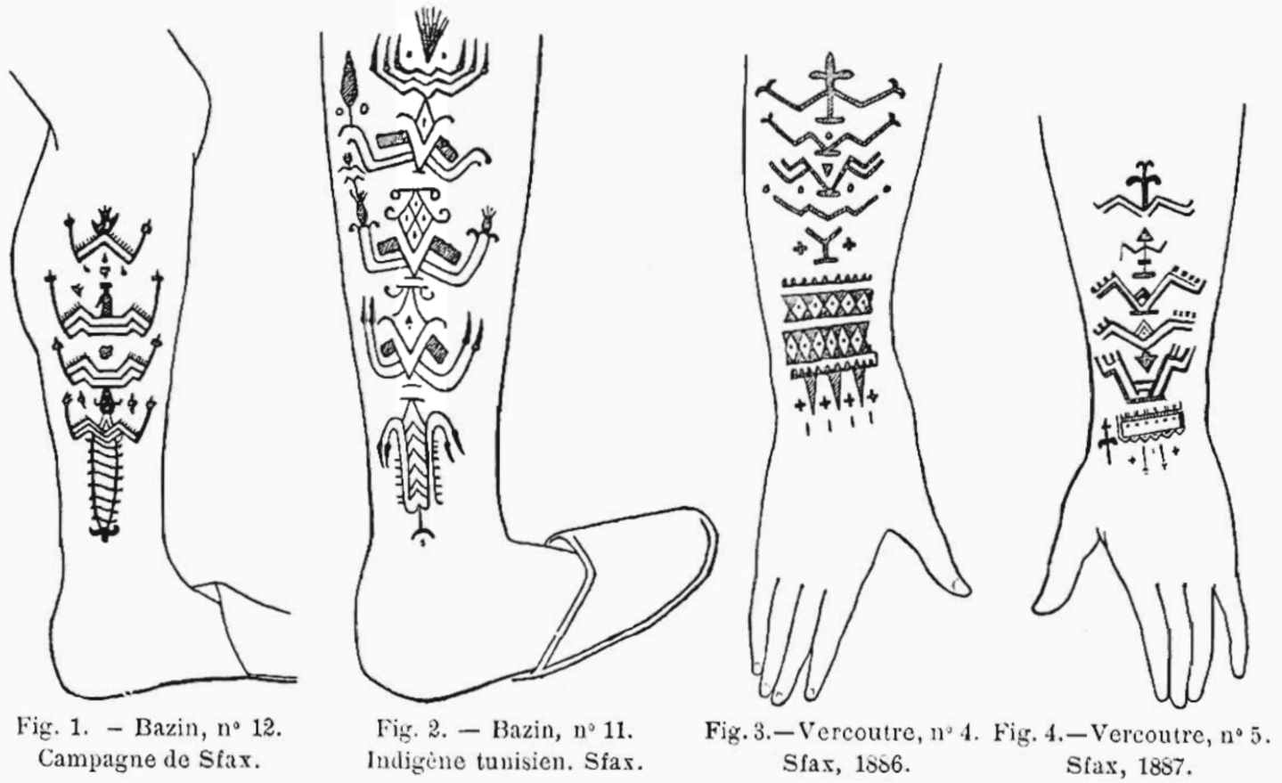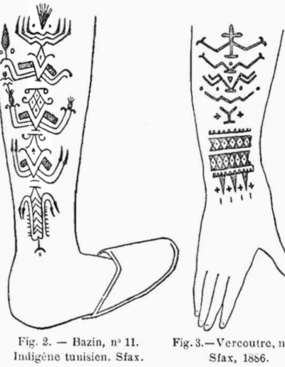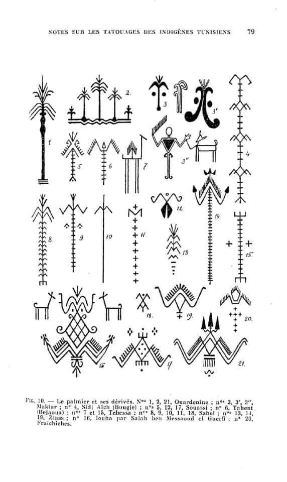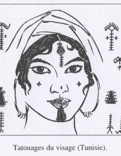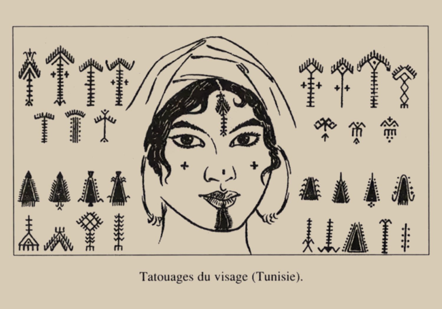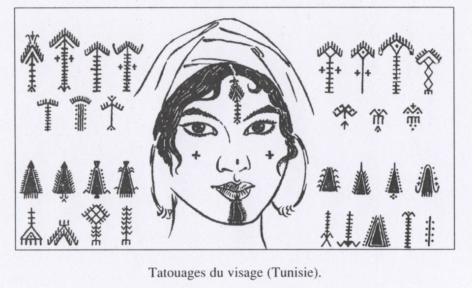 Vertical chin line (siyala) — the first tattoo, marking puberty. A straight line from the lower lip to the chin, sometimes flanked by dots (representing seeds) or by small triangular forms. The siyala is associated with fertility and with the goddess Tanit — the Phoenician-Carthaginian deity of fertility and the moon, whose worship predates Islam in North Africa by more than a millennium. The connection between the siyala and Tanit is debated among scholars, but the association is cited in multiple ethnographic accounts.
