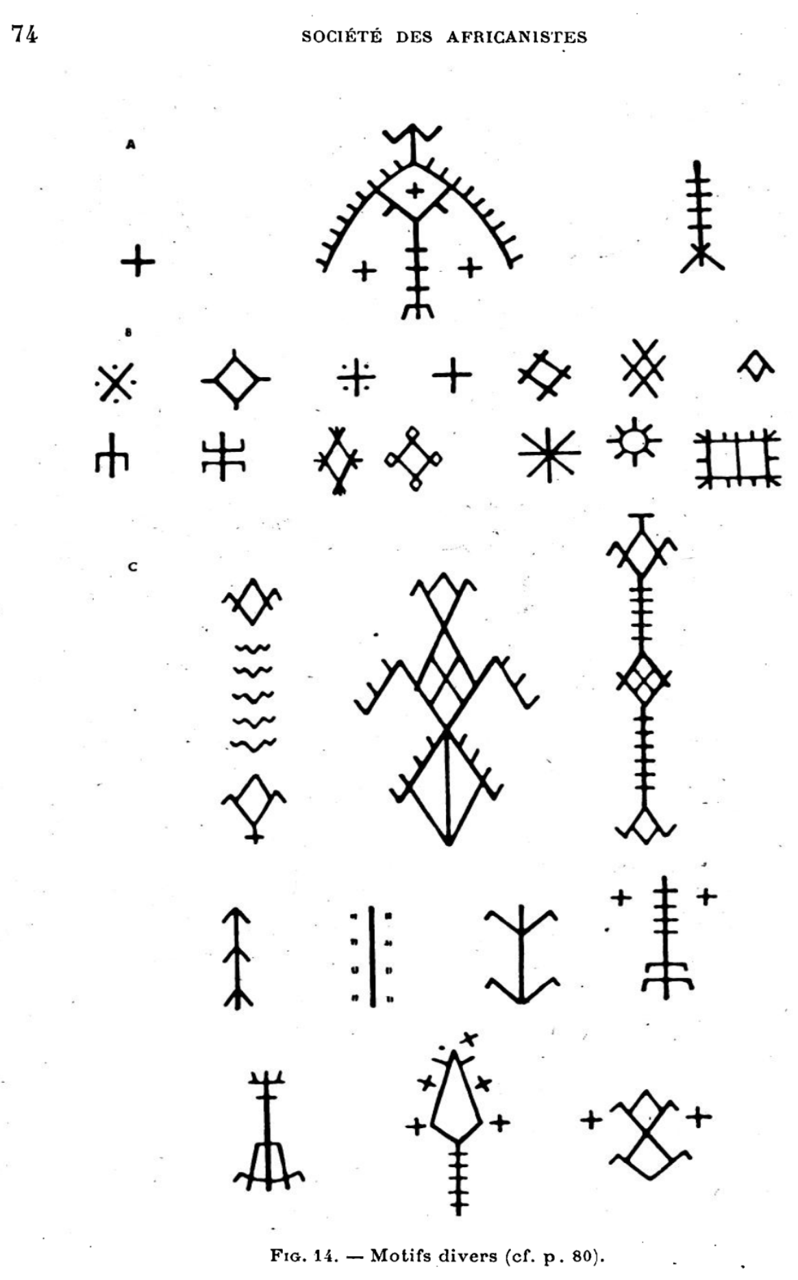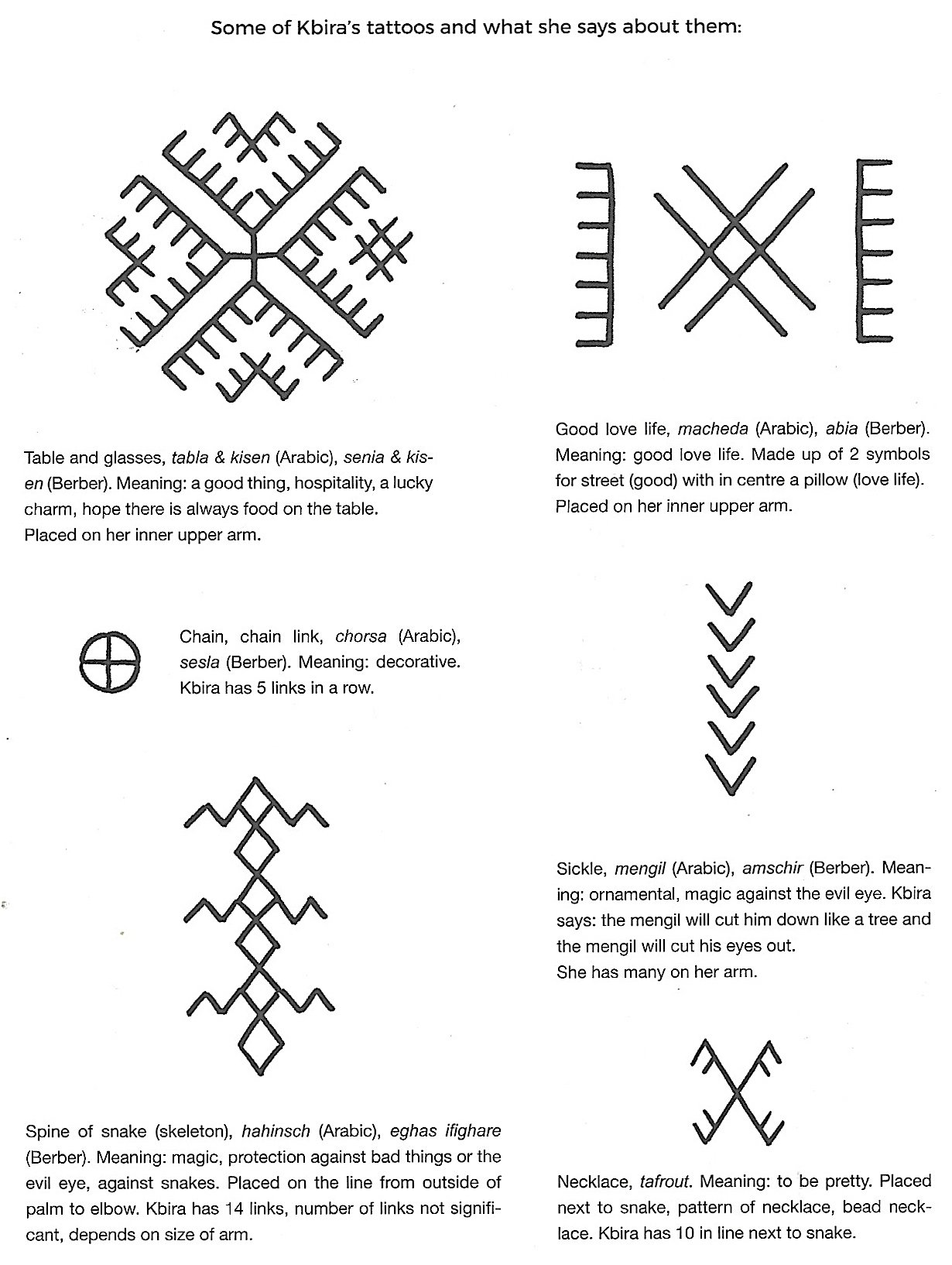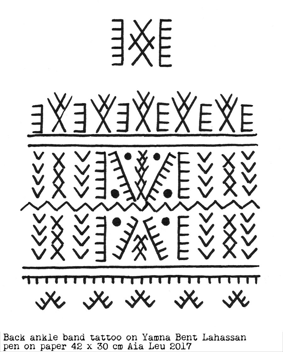 Vertical chin line (siyala) — the first tattoo, marking puberty. A straight line from the lower lip to the chin, sometimes flanked by dots (representing seeds) or by small triangular forms. The siyala is associated with fertility and with the goddess Tanit — the Phoenician-Carthaginian deity of fertility and the moon, whose worship predates Islam in North Africa by more than a millennium. The connection between the siyala and Tanit is debated among scholars, but the association is cited in multiple ethnographic accounts.