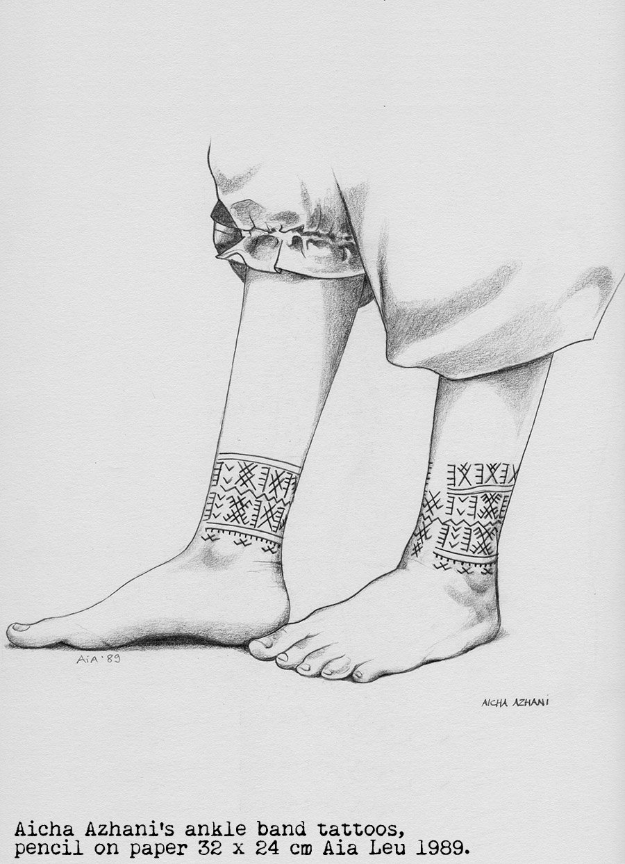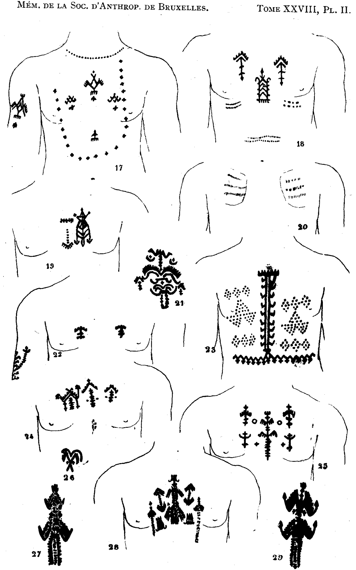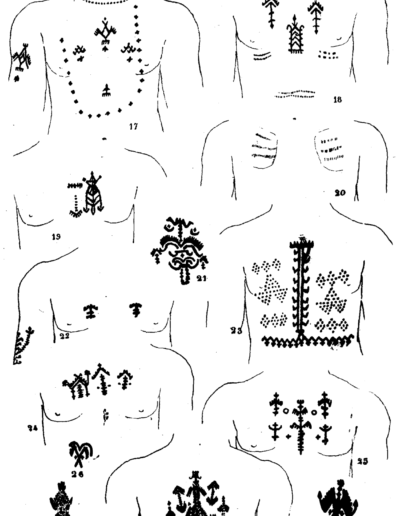 The arms and chest received tattoos in some traditions, particularly among women in more rural or remote communities. Intimate tattooing — on the breasts, the abdomen, or near the genitals — is mentioned in ethnographic accounts as a wedding-related practice in some regions.