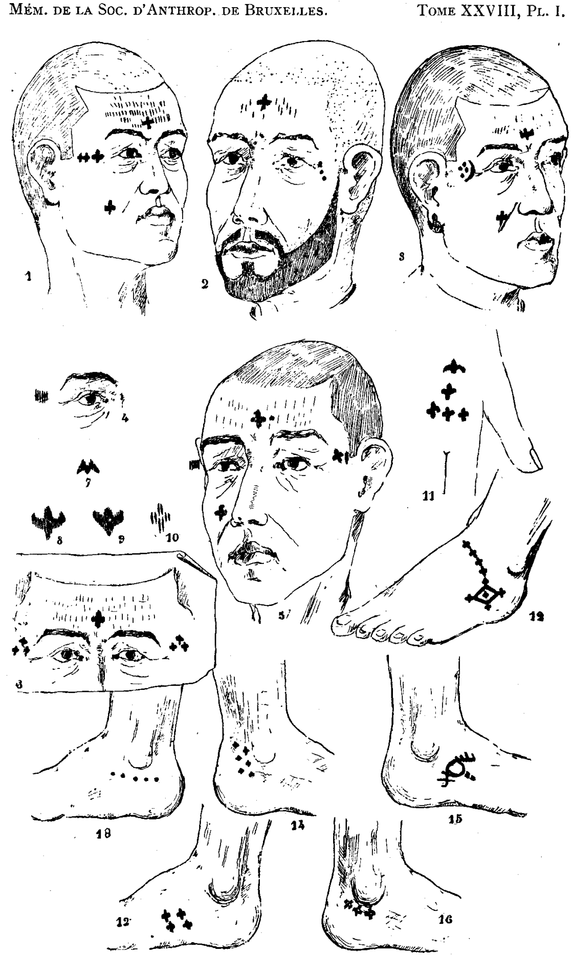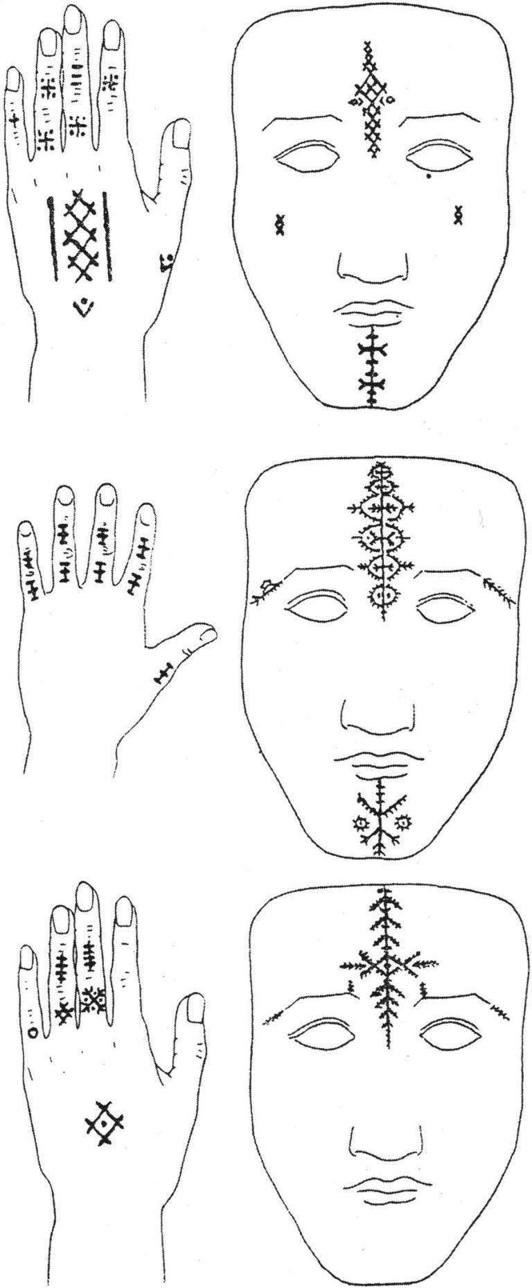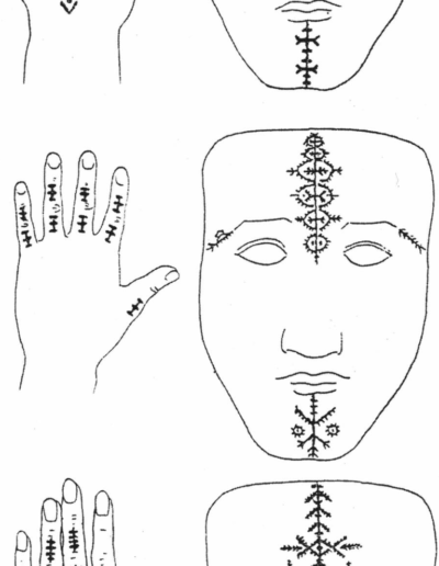 The hands and feet were tattooed both protectively (guarding the extremities, which are exposed and vulnerable) and decoratively. Hand tattoos, in particular, show the most elaborate patterning in some regional traditions, with fine geometric fills covering the backs of the hands and fingers.