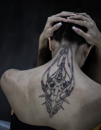 Discuss the design process. Biomechanical compositions are typically custom—designed for the client’s body, incorporating their specific anatomy into the design. An artist who wants to discuss the body’s structure, draw the body freehand, or create a detailed digital mock-up before tattooing is demonstrating the compositional seriousness the style demands. A generic biomechanical design applied without body-specific adaptation will look generic.