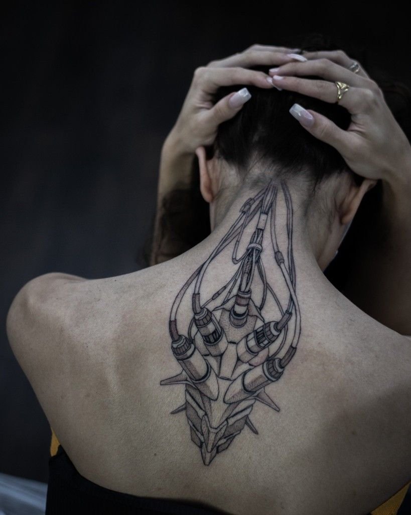 Biomechanical tattoos share a set of visual characteristics that make the style recognisable.