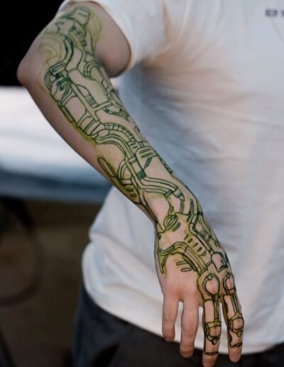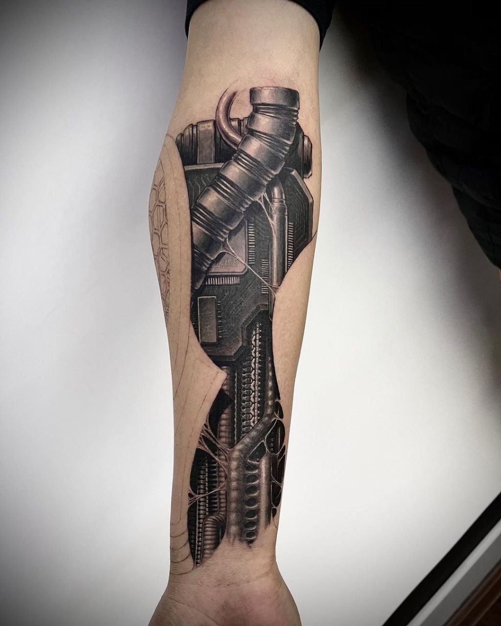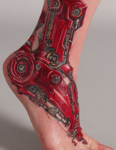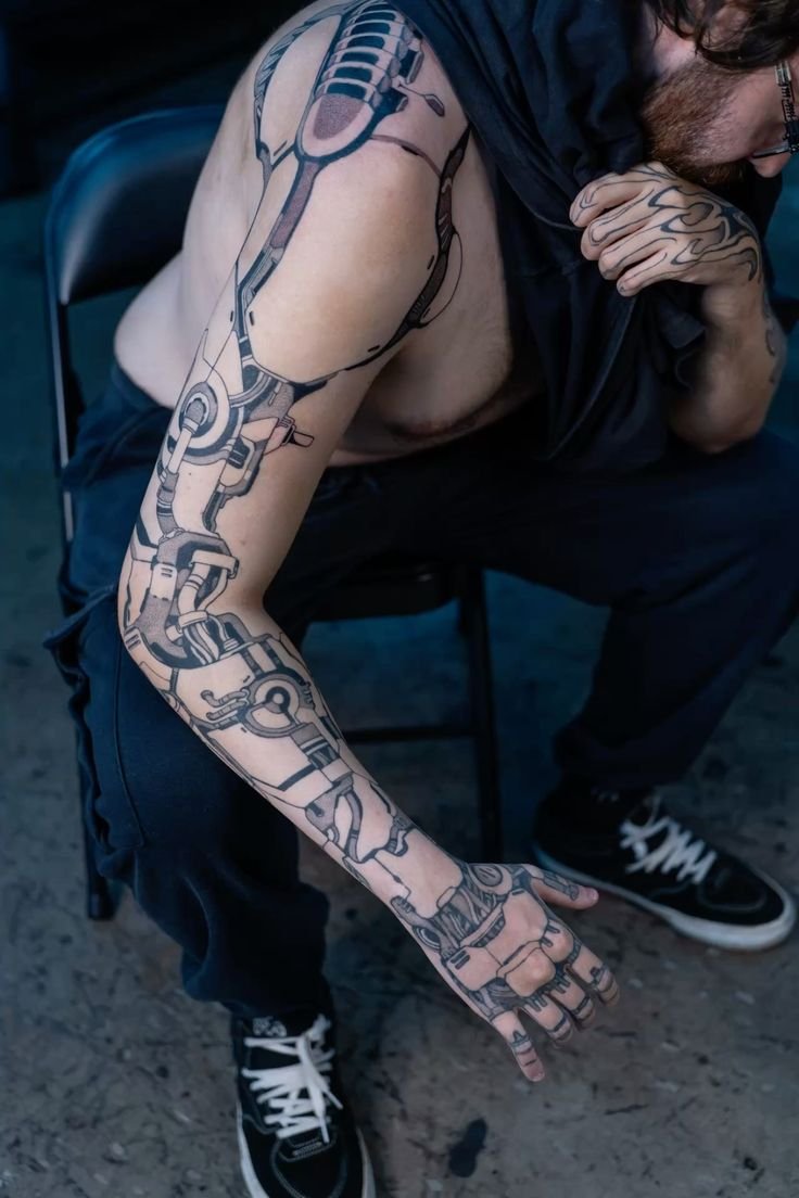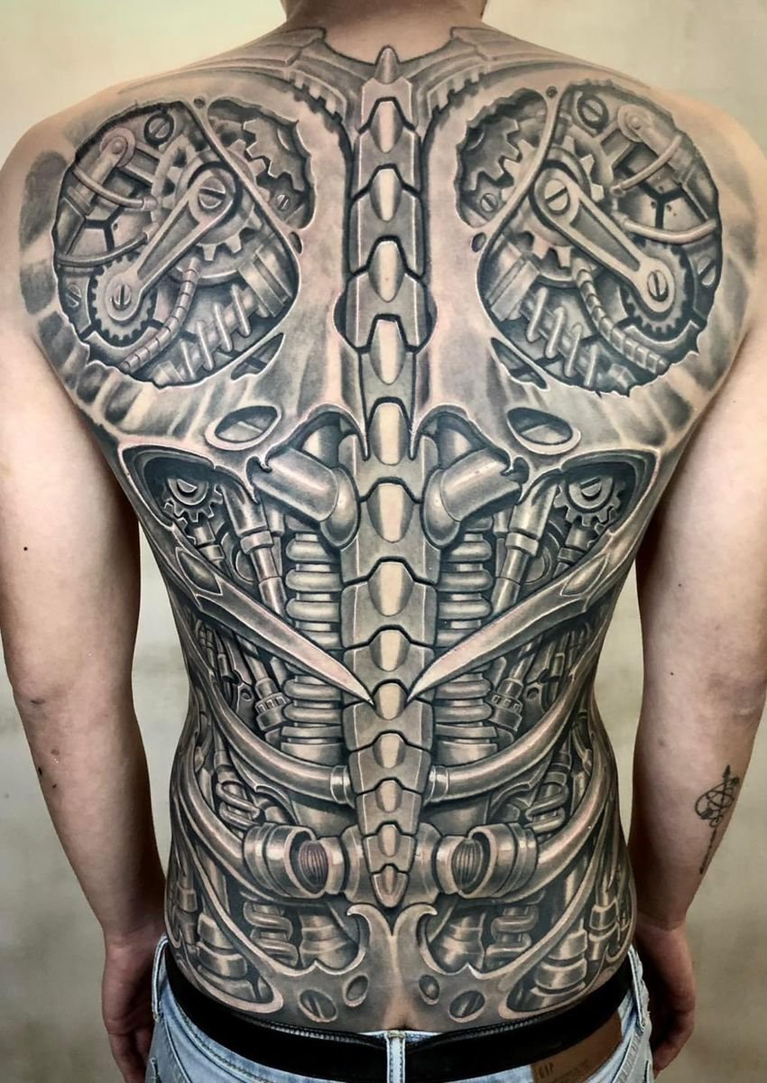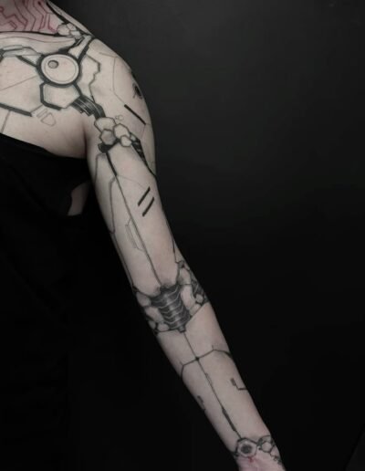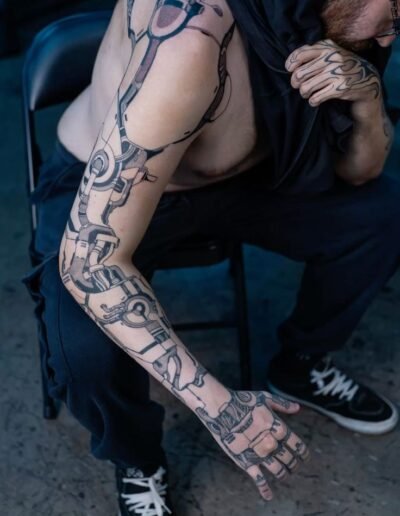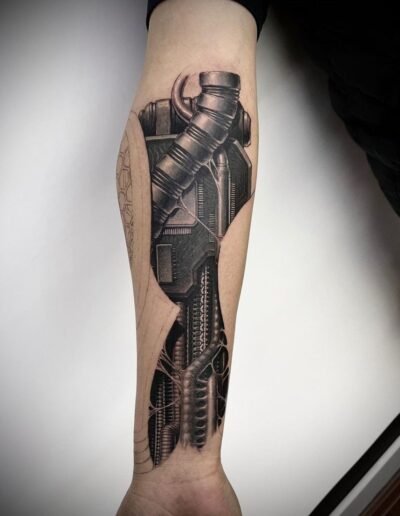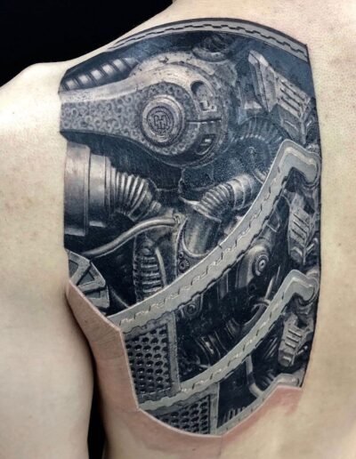 Biomechanical tattooing creates the illusion that the body contains machinery. The skin is treated as a surface that can be opened, peeled back, or made transparent, revealing an interior that is part biological and part technological. The style fuses organic anatomy — bone, muscle, tendon, vascular tissue — with mechanical components — gears, pistons, cables, tubing, plating, circuitry — into a single coherent system. The result is a body that appears to be a hybrid organism: human on the outside, something else underneath.
