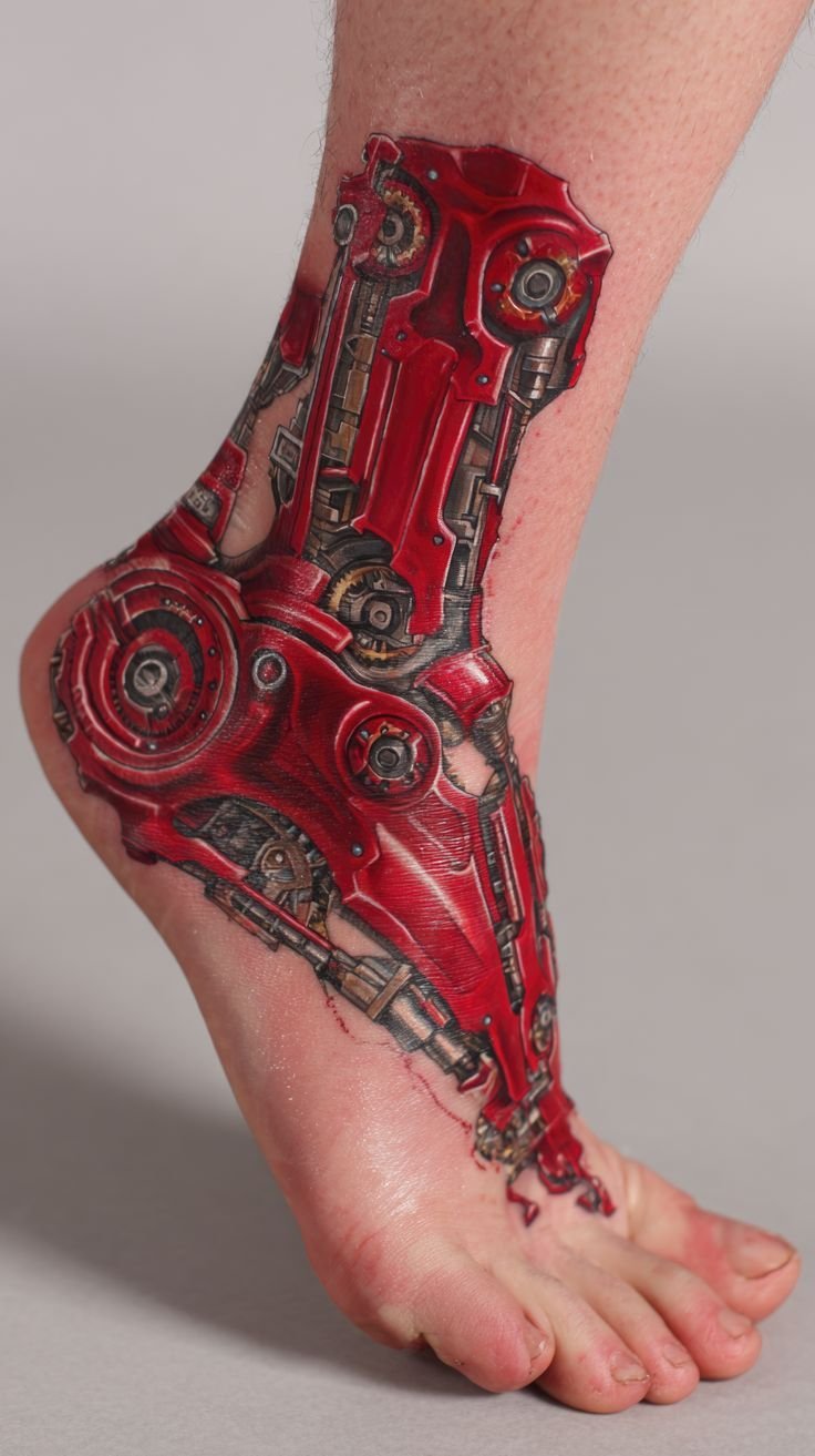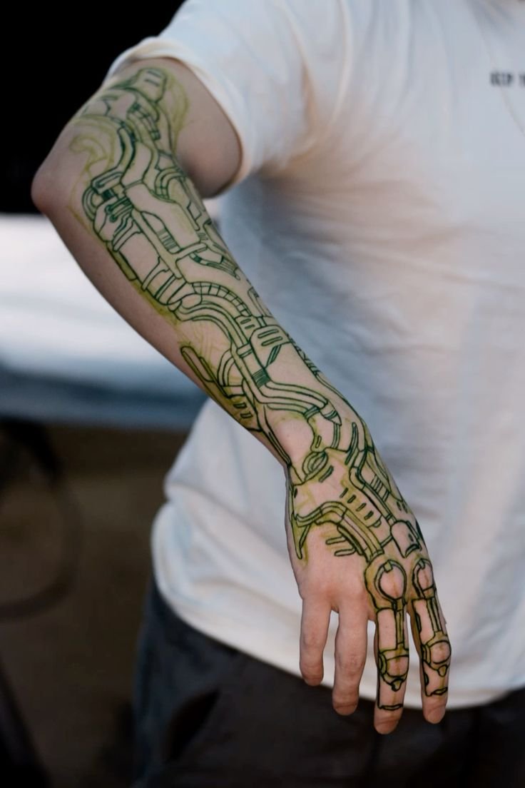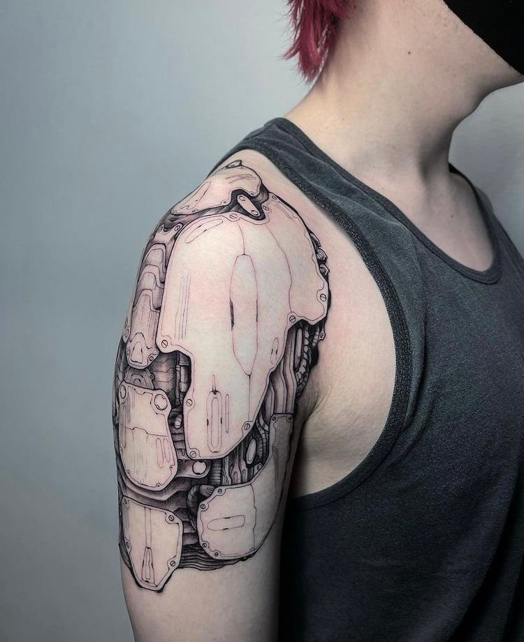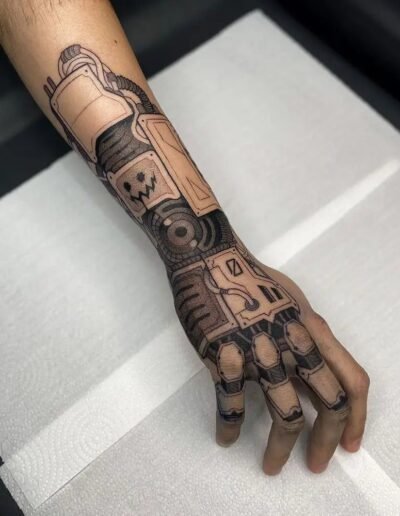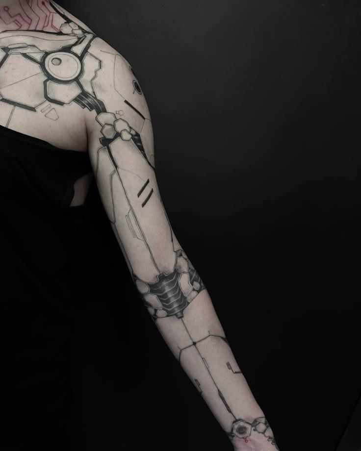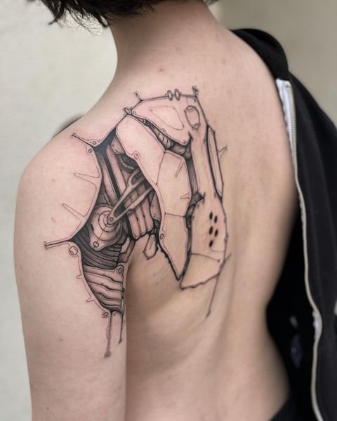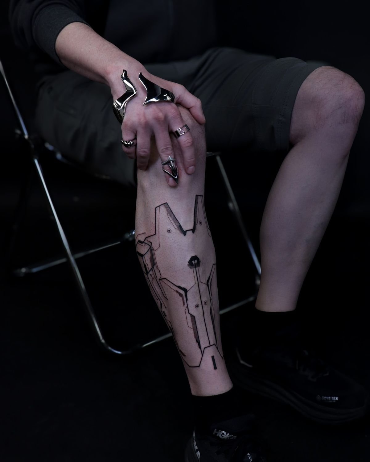 Biomechanical tattooing creates the illusion that the body contains machinery. The skin is treated as a surface that can be opened, peeled back, or made transparent, revealing an interior that is part biological and part technological. The style fuses organic anatomy — bone, muscle, tendon, vascular tissue — with mechanical components — gears, pistons, cables, tubing, plating, circuitry — into a single coherent system. The result is a body that appears to be a hybrid organism: human on the outside, something else underneath.