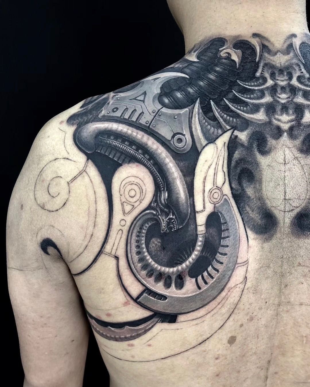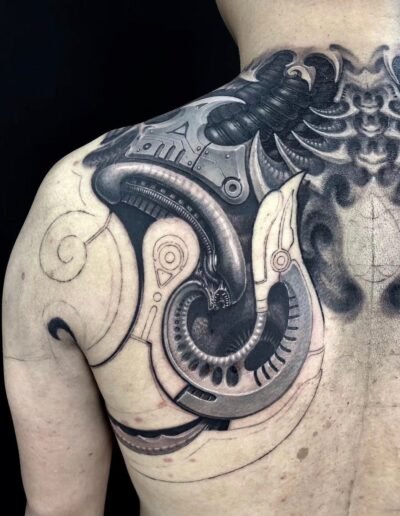 Black-and-grey biomechanical, being built from the most stable pigment, ages better than colour work in the same style. The classic Giger-derived monochrome approach is, from a longevity standpoint, the safest version of the style.
