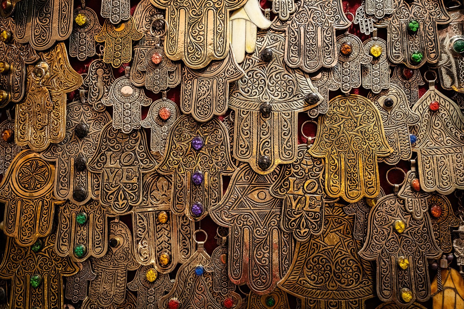 Moroccan Jewish communities, before the mass emigration of the mid-twentieth century, used the khamsa extensively, and the symbol is one of the clearest examples of a shared visual culture between Jewish and Muslim communities in the Maghreb. Moroccan khamsa designs — often highly ornamental, incorporating geometric patterns, filigree metalwork, and coloured enamel — represent a distinct regional aesthetic that differs from the simpler forms found in Levantine or South Asian usage.