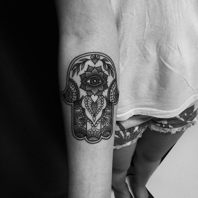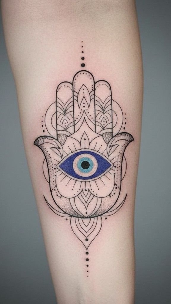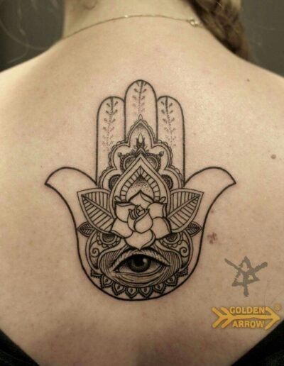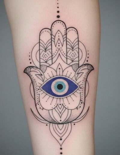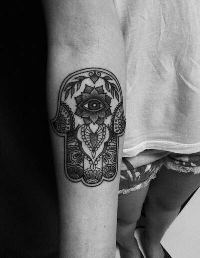 Internal decoration is where the piece lives or dies. A hamsa with a blank interior is a simple design. A hamsa with detailed internal patterning — geometric, floral, or mandala-based — is a much more complex piece that requires real compositional and technical skill. The quality of the internal decoration is usually what separates a strong hamsa tattoo from a weak one.