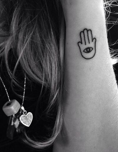 Fine line. A simple hamsa outline, with or without an eye, at a small to medium scale. The minimalist approach is common in first tattoos and in placements that favour discreet work. The fine-line hamsa has become one of the most recognisable images in the contemporary fine-line vocabulary.