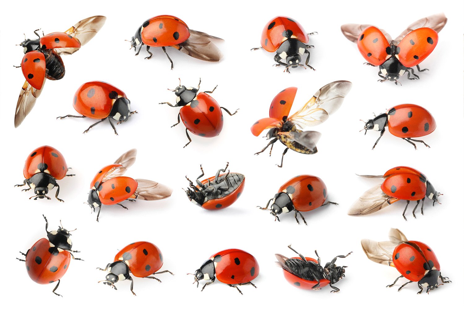 The insects most people call ladybugs are coccinellids — a family of beetles with around six thousand described species worldwide. The seven-spot ladybird, Coccinella septempunctata, is the European archetype: glossy red, three spots on each wing case, one shared across the seam. The two-spot, the ten-spot, the twenty-two-spot all exist. So does the harlequin, Harmonia axyridis, an Asian species now widespread across Europe and North America, which comes in colour variants ranging from orange with black spots to black with red spots.