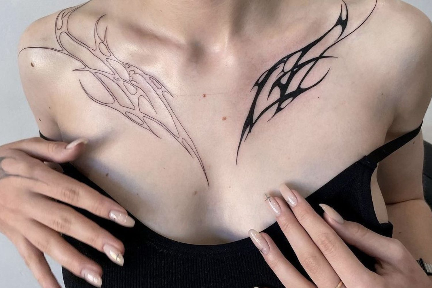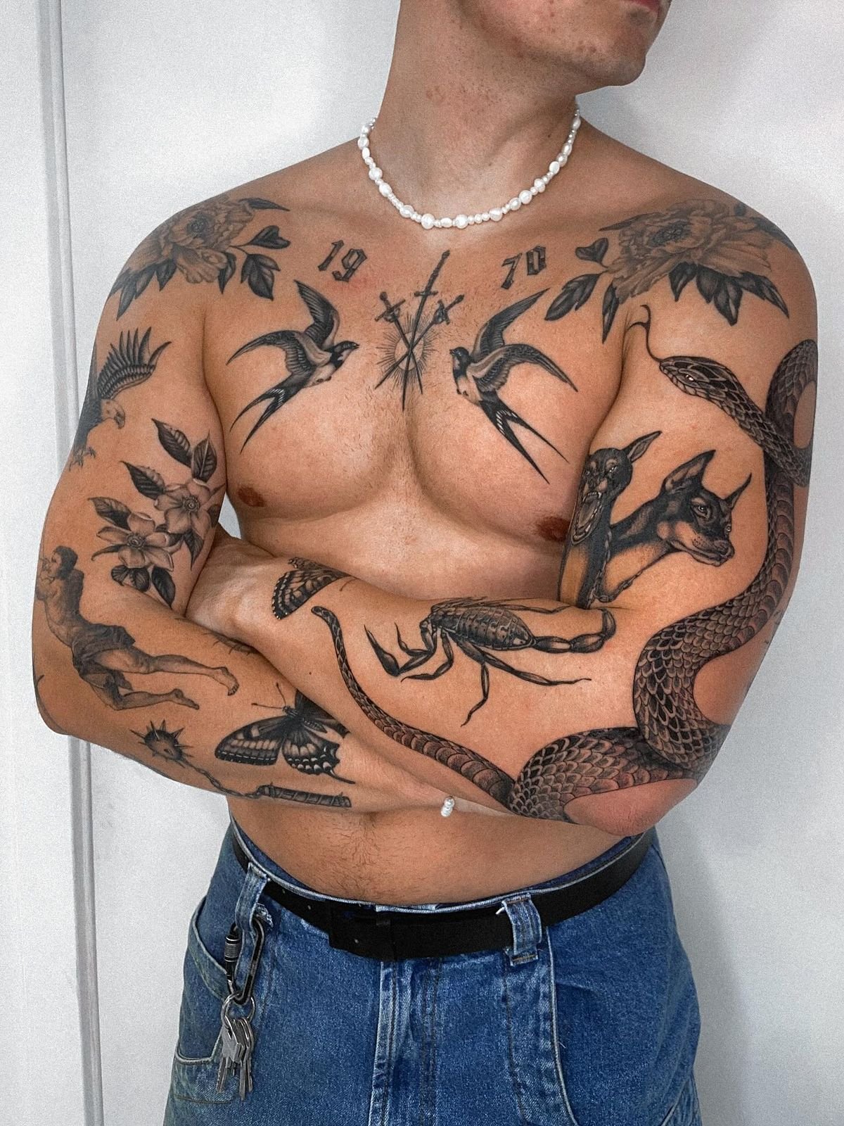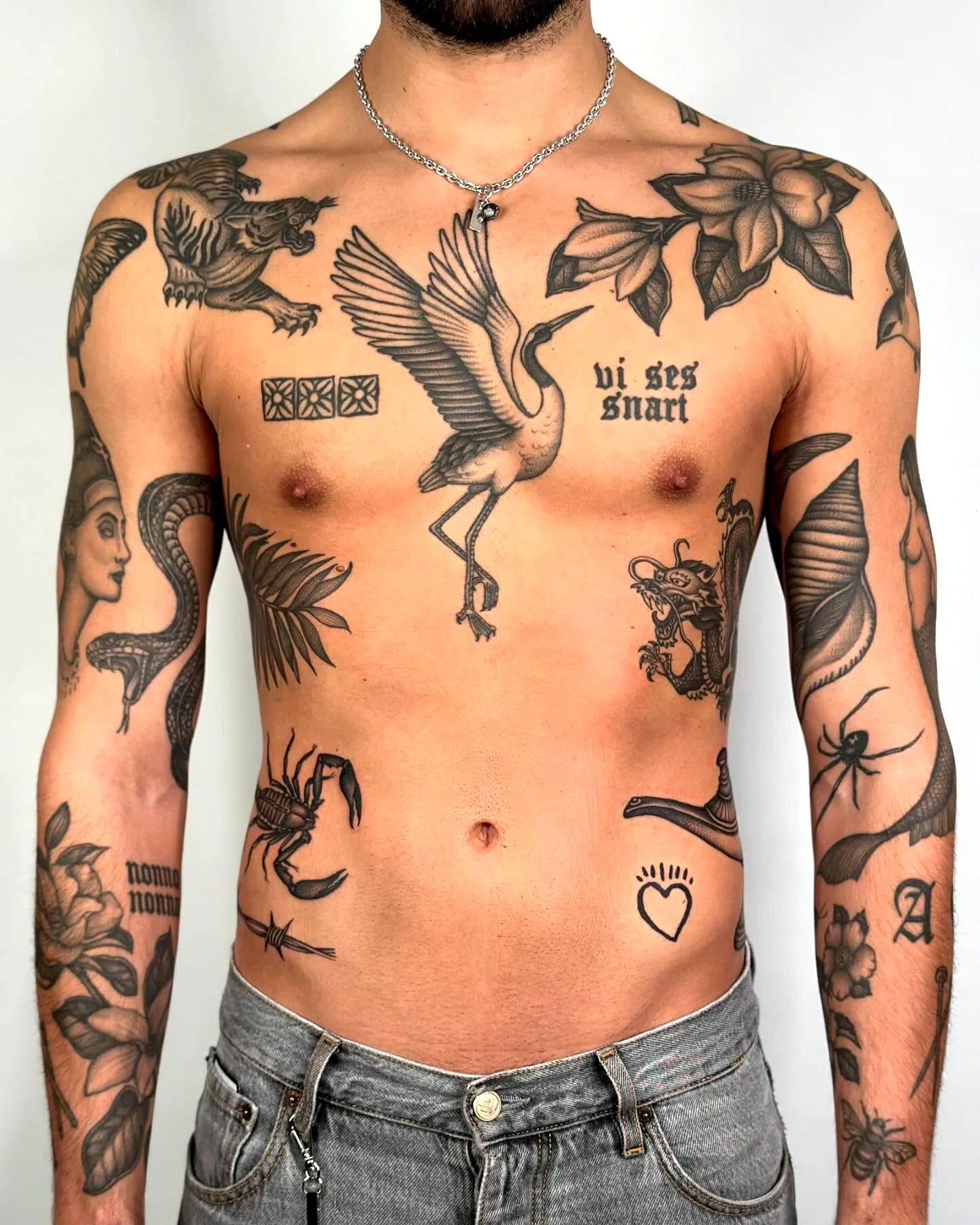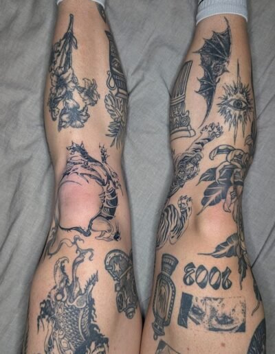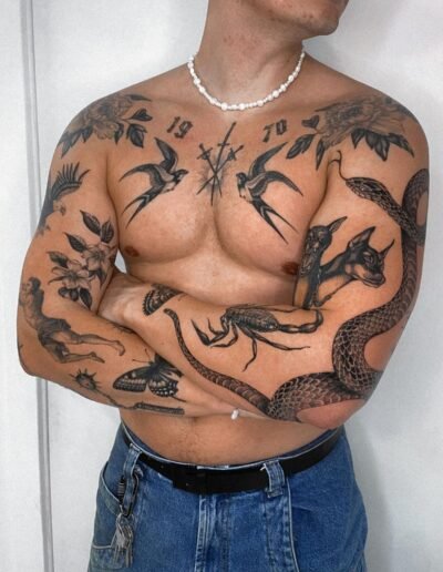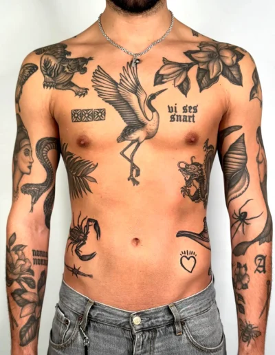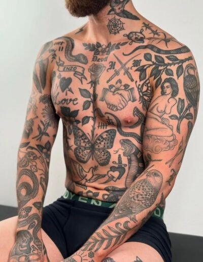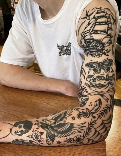 The advantage: each piece is self-contained, so a piece that ages poorly does not damage the surrounding pieces. A fine line butterfly that softens over five years sits next to a traditional anchor that looks the same as it did on day one, and the anchor is unaffected. In a unified sleeve, a section that ages badly can compromise the reading of the entire composition. In patchwork, it compromises only itself.