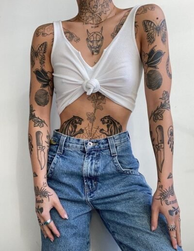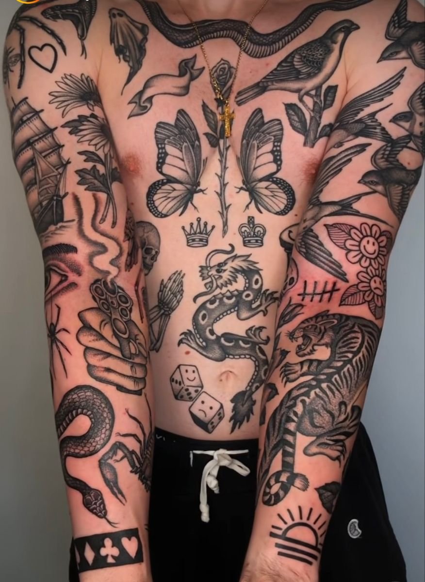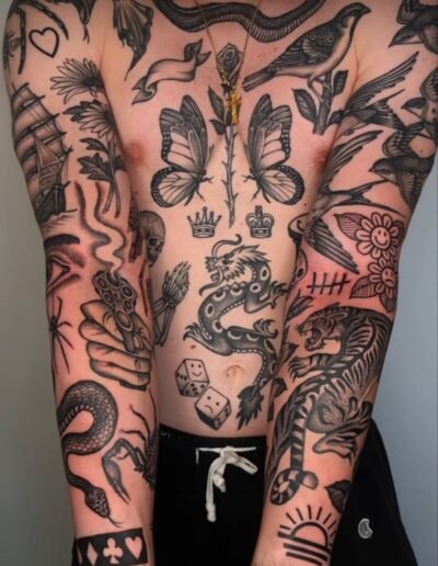 A sleeve built from twenty separate pieces: a traditional rose next to a fine line butterfly, a small geometric triangle above a script date, a blackwork moth beside a neo-traditional fox, a tiny mushroom filling a gap near the elbow. Each piece is self-contained. Each was probably done at a different time, possibly by a different artist, possibly in a different city. They sit near each other with bare skin between them, like patches sewn onto a jacket or stickers arranged on a laptop case. Together they form something — a visual autobiography, a collection, a curated accumulation — but they were never designed as a unified composition.