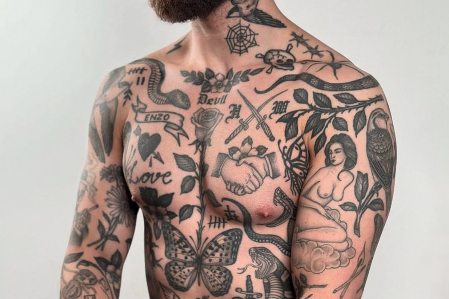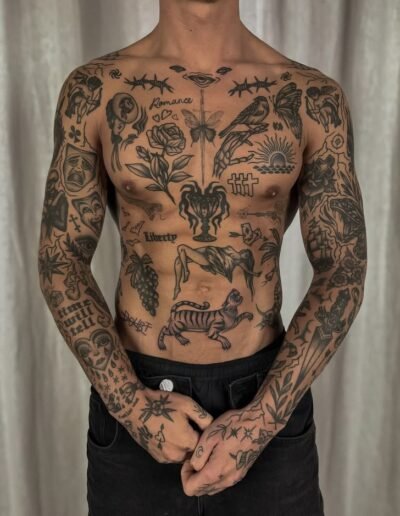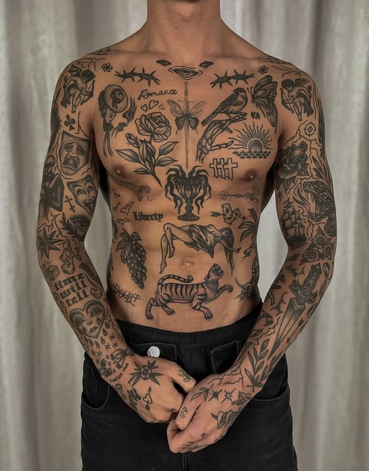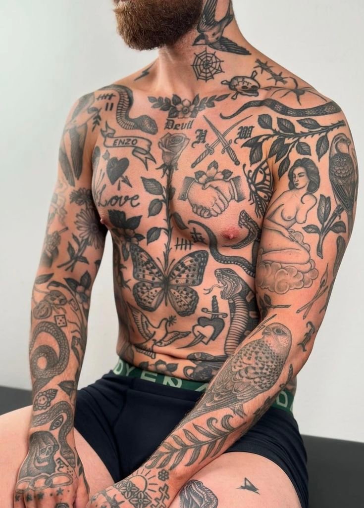 This is patchwork tattooing. The term has gained currency in the 2020s as a named approach to collecting tattoos, but the practice it describes is as old as tattooing itself. Every sailor who accumulated flash pieces over the course of a career — a swallow after one voyage, an anchor after another, a name on the chest, a pin-up on the forearm — was building a patchwork. Every person who got their first tattoo at eighteen, added a second at twenty-three, and a third at twenty-eight, without a master plan, was building a patchwork. What is new is the naming and the intentionality: people now choose the patchwork approach on purpose, plan for it from the first piece, and treat the accumulated, unconnected arrangement as a deliberate aesthetic.
