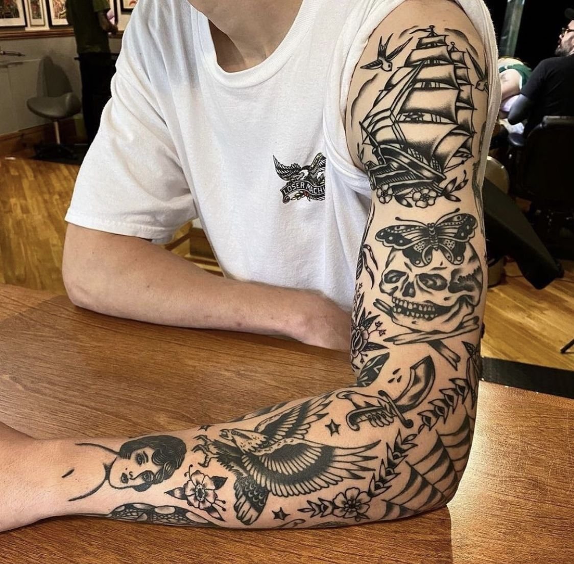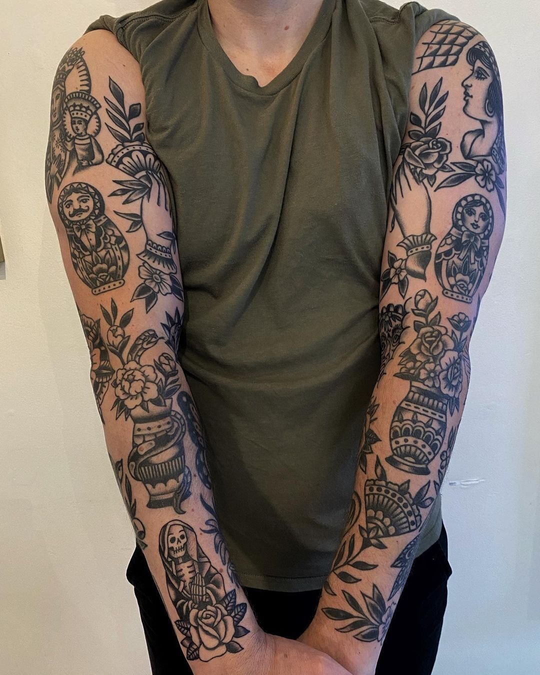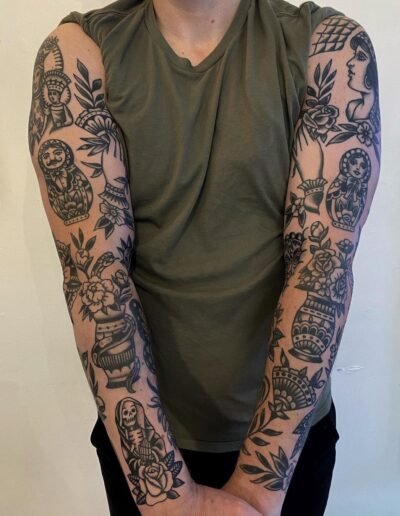 - A traditional sleeve is a unified composition — a single design, or a set of connected designs with shared background (wind bars, water, clouds, colour washes), planned as a whole and often executed by a single artist over multiple sessions. The viewer sees a single image that wraps around the arm. The individual elements are subordinate to the whole.
