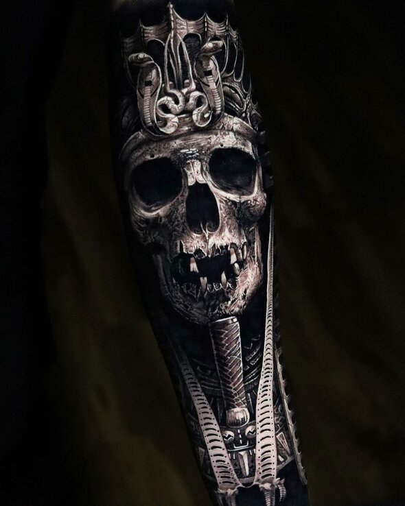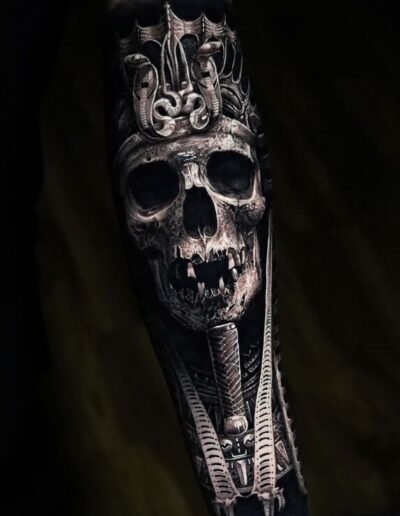 Surrealism and composite realism — pieces that apply the technical vocabulary of realism to subjects that do not exist, or to composite images (a clock face melting into a hand, a mountain range inside a human silhouette). The rendering is realistic; the subject is fabricated. This branch includes much of the biomechanical work that Aaron Cain, Guy Aitchison, and others developed from the 1990s onward.