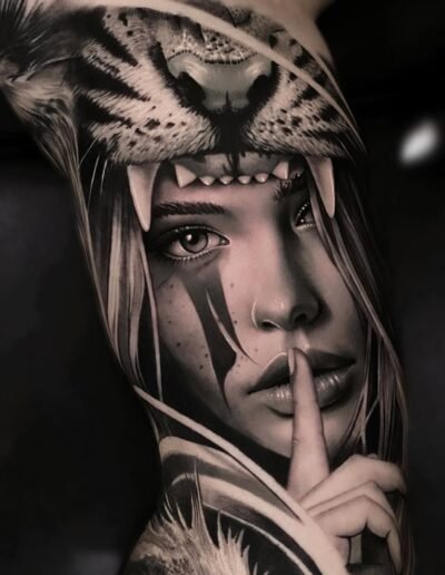 Composition should work against the body, not against the photograph. A realism piece designed as a rectangular print, with sharp boundaries and a flat frame, will fight the body’s curvature and flow. The best realism compositions either fade into the skin at the edges (a portrait with hair dissolving into stippling, a subject rendered against an out-of-focus dark background that bleeds into skin) or accept the body’s shape as part of the composition.