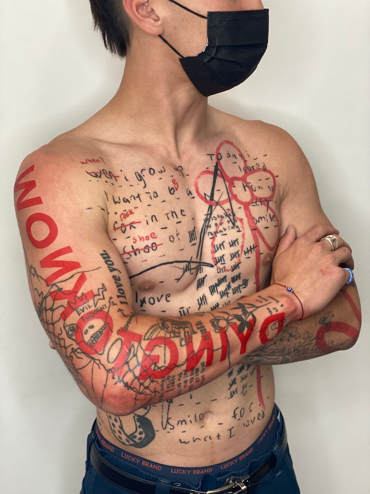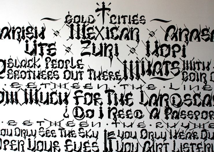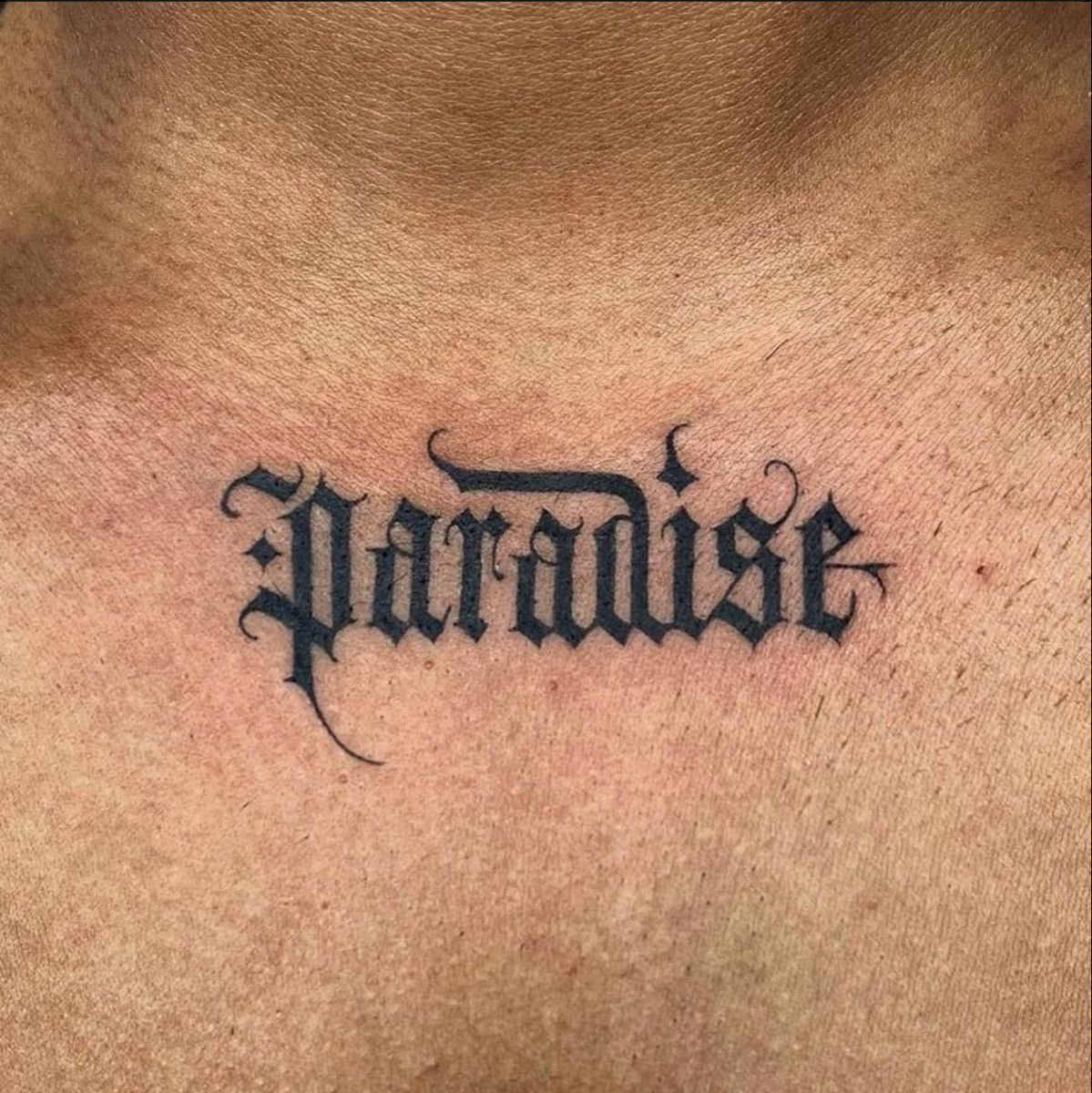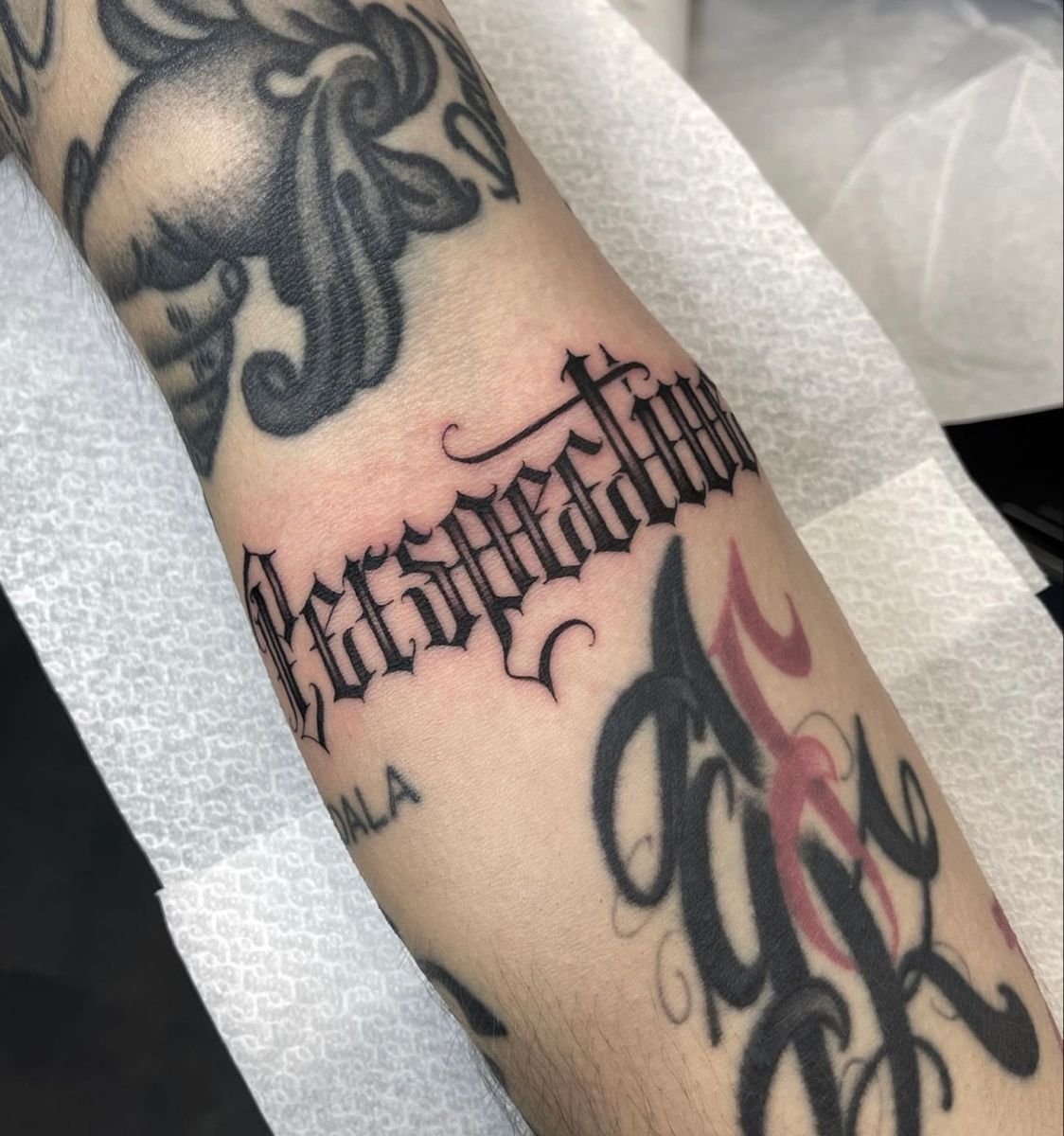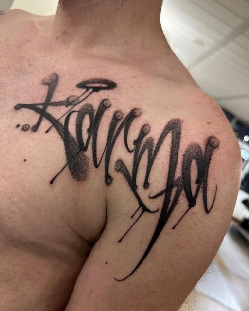 A name in flowing cursive along the inside of a forearm. A single date in Roman numerals across the collarbone. A word in blackletter — thick, angular, medieval — spanning the width of the upper back. A Chicano script tattoo reading familia in elaborate, shadowed, flourished letters that took longer to execute than most portraits. A line of Arabic calligraphy running from right to left below the ribs. A typewriter-font quote on the inner bicep. The word “breathe” in someone’s own handwriting on the wrist.