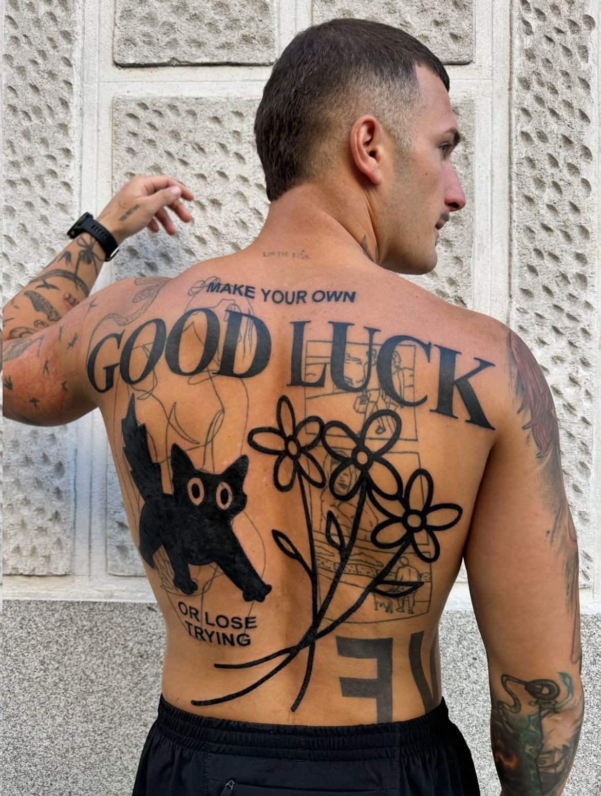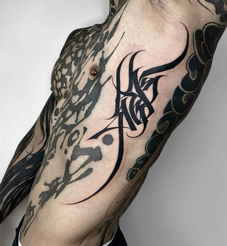 A word or phrase must be sized and placed to sit correctly on the body part it occupies — following the curvature of the ribs, fitting the width of the forearm, centring on the spine or the sternum. A word that is too long for the available space will be compressed at the end; a word placed without regard for the body’s curvature will appear to droop or tilt. Composing lettering for the body requires the artist to think about the three-dimensional surface, not about the word as it appears on a flat screen.