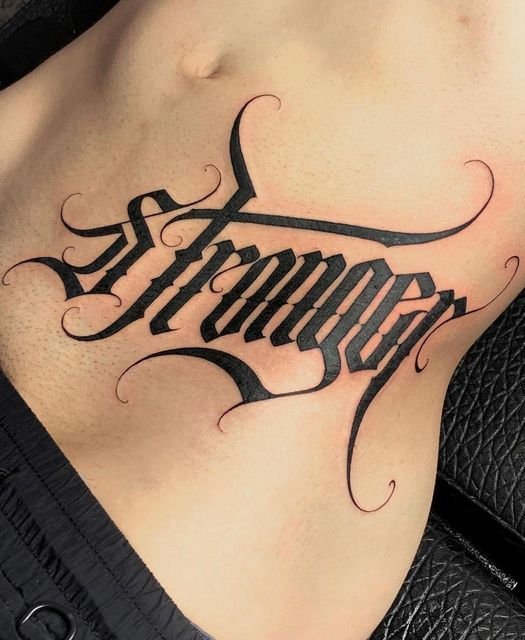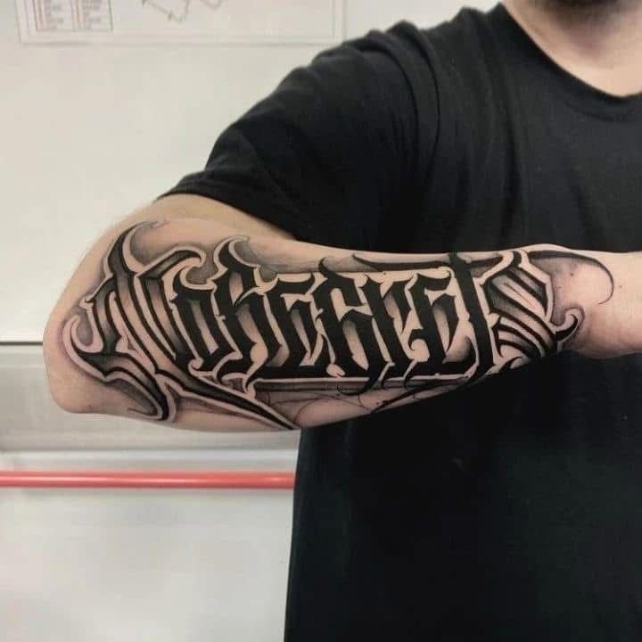 In tattoo contexts, blackletter is most commonly used for single words or short names — Loyalty, Respect, Family, a surname, a place name. The letters are heavy, angular, and visually commanding. They sit well on the upper back, the chest, the forearms, and — in the Chicano tradition — across the abdomen. Blackletter at large scale is one of the most graphically powerful lettering options in tattooing.
