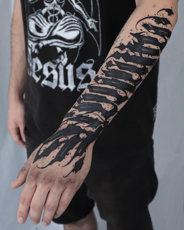 • Bold, heavy lettering — blackletter at large scale, heavy serif, thick script — ages well. The strokes are wide enough to absorb the slight thickening that comes with pigment migration over time, and the letterforms remain readable for decades. A large blackletter word across the upper back, applied in 2005, will still be legible in 2035.